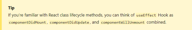 설명을 보면, componentDidMount, componentDidUpdate, componentWillUnmount를 모두 합쳐 놓은 것과 같은 기능을 하는 것이 useEffect임을 알 수 있다.