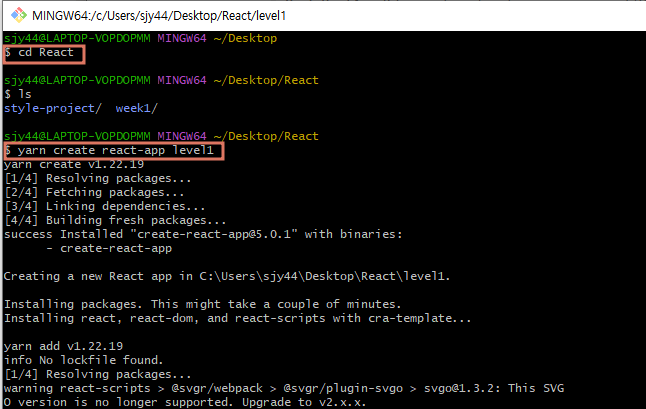 - yarn create react-app 프로젝트명 실행 (npm 사용시, npm init react-app 프로젝트명 실행)
